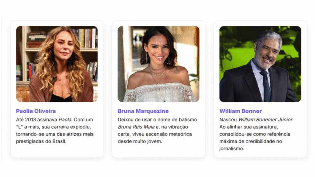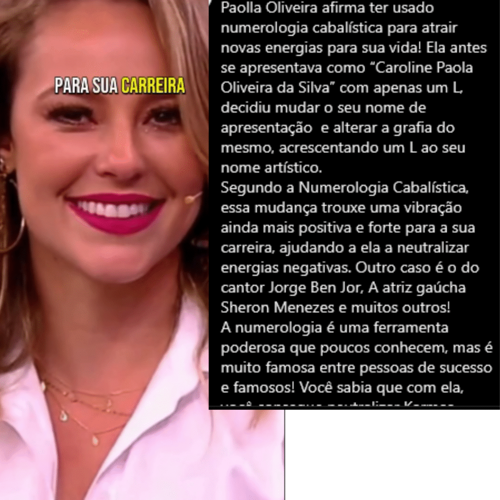 Paolla Oliveira — referências em redes e matérias citando que ela usou numerologia (menções a “numerologia cabalística” em publicações sobre celebridades). Instagram