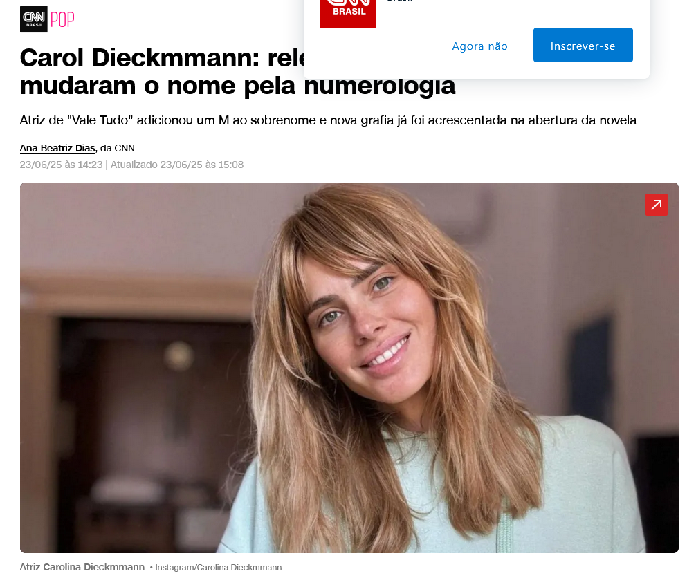 Carolina Dieckmann — alteração recente na grafia do nome com menção pública a numerologia; matéria da CNN Brasil documentando o fato. CNN Brasil